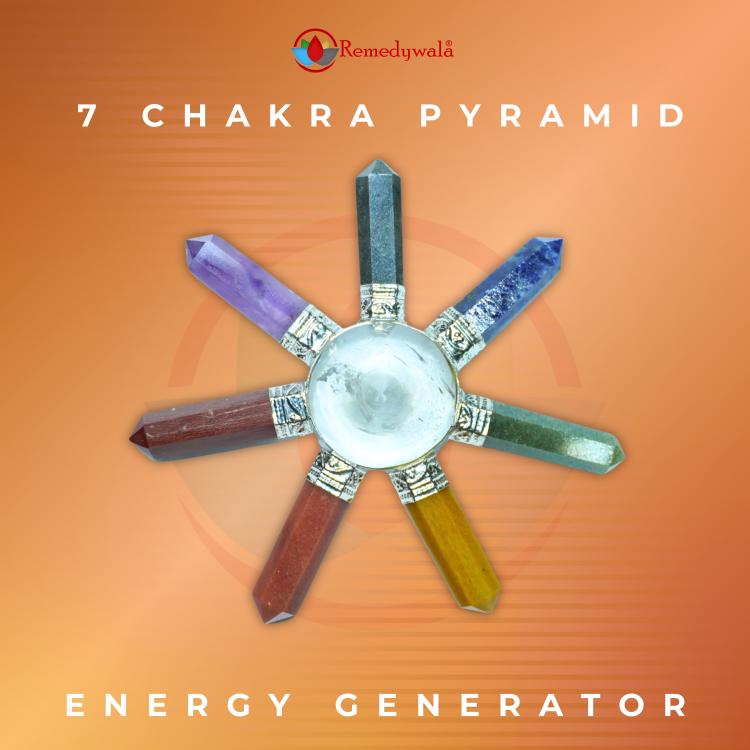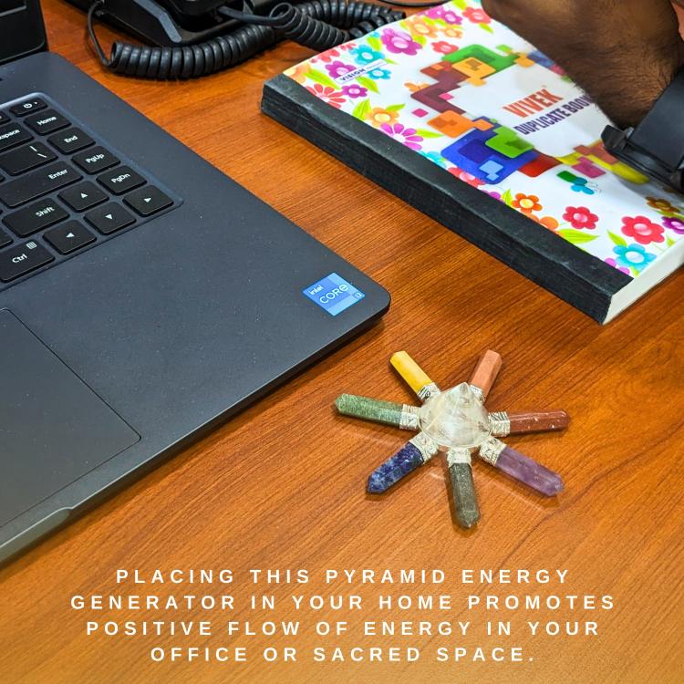The generator is a collection of natural faceted points in the 7 Chakra colors affixed to the base of a clear quartz pyramid.