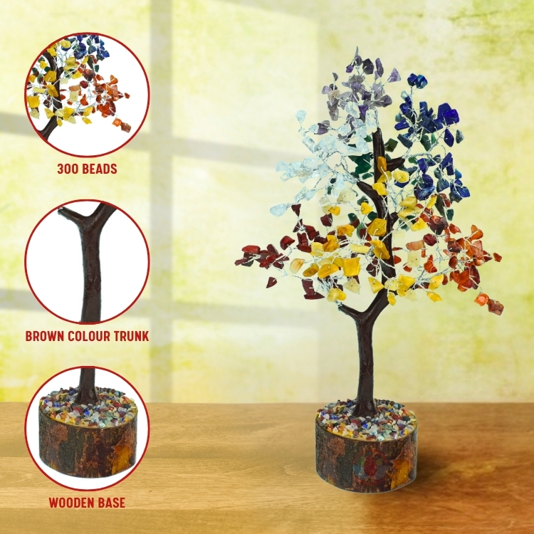 【ABOUT CRYSTAL TREE MATERIAL】:- Seven Chakra Chips Stones and wood block, Beads: 500 approx.