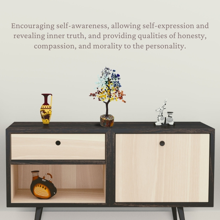【SEVEN CHAKRA GEMSTONE TREE BENEFITS】:- Encouraging self-awareness, allowing self-expression and revealing inner truth, and providing qualities of honesty, compassion, and morality to the personality.