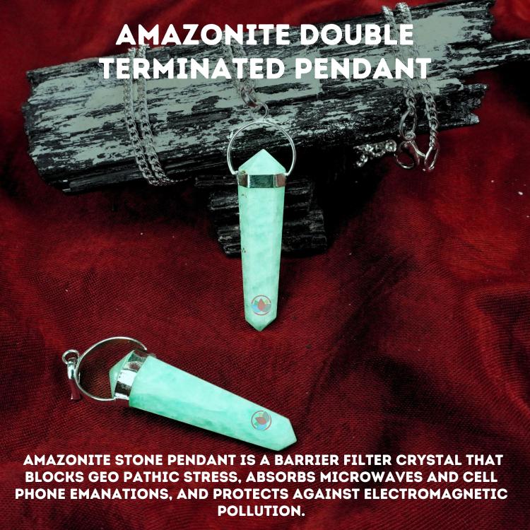 - Amazonite Stone Pendant is a Barrier Filter crystal that blocks geo pathic stress, absorbs microwaves and cell phone emanations, and protects against electromagnetic pollution.