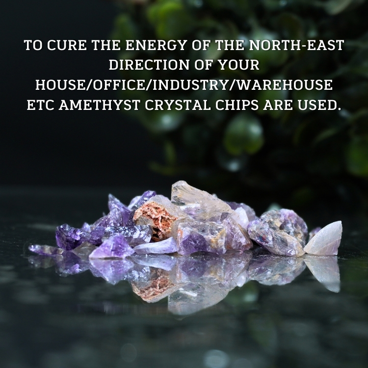 • To cure the energy of the North-East direction Amethyst crystal chips are used. Placing Amethyst in the North-East corner of your home can help you relieve tension. You can manage your stress and tight schedule beautifully with the help of Amethyst. This stone or crystal can be placed easily on any desk or shelves.