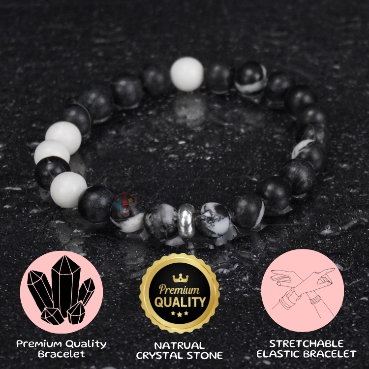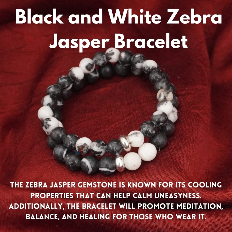 - The Zebra Jasper gemstone is known for its cooling properties that can help calm. Additionally, the bracelet will promote meditation and balance for those who wear it.