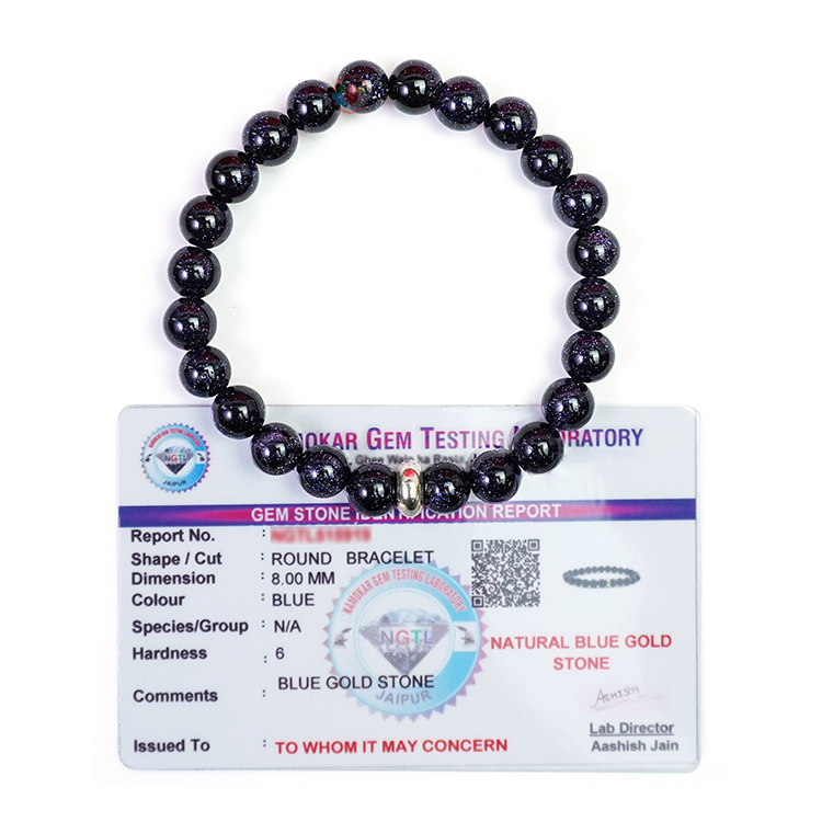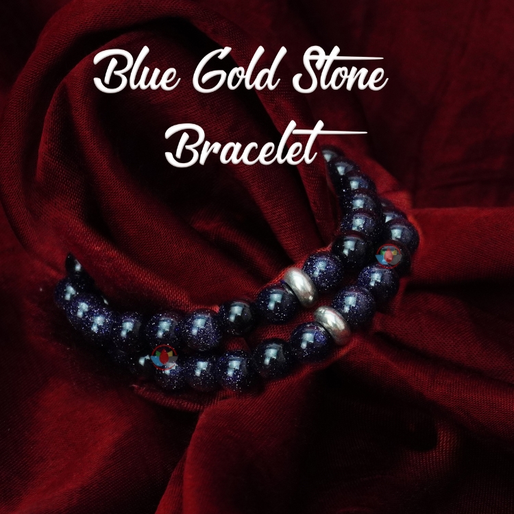 - Blue Goldstone is man-made glass infused with copper particles and with cobalt, manganese, or chromium additions resulting in a deep, shimmery blue gold color. Because glass is made from Quartz sand it is used in the healing community.