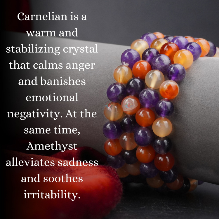 - Carnelian and Amethyst together is the perfect combination for you. Carnelian is a warm and stabilizing crystal that banishes spiritual negativity.