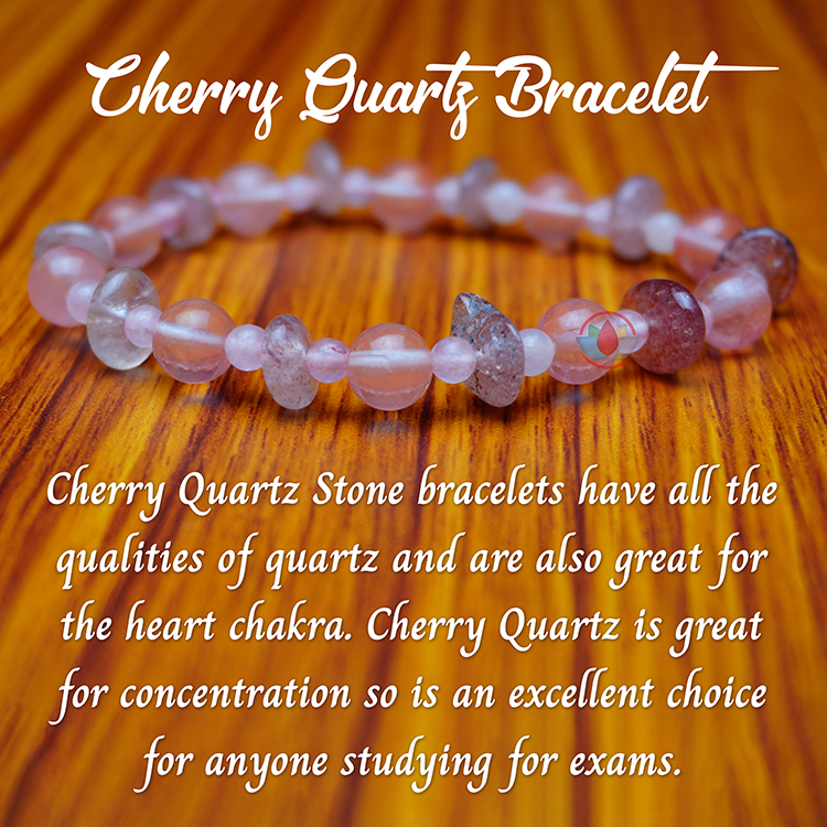 - Cherry Quartz Stone bracelets have all the qualities of quartz and are also great for the heart chakra. Cherry Quartz is great for concentration so is an excellent choice for anyone studying for exams.