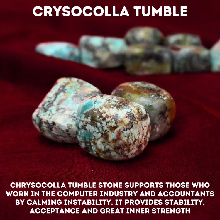 - Chrysocolla Tumble Stone supports those who work in the computer industry and accountants by calming instability. It provides stability, acceptance and great inner strength.