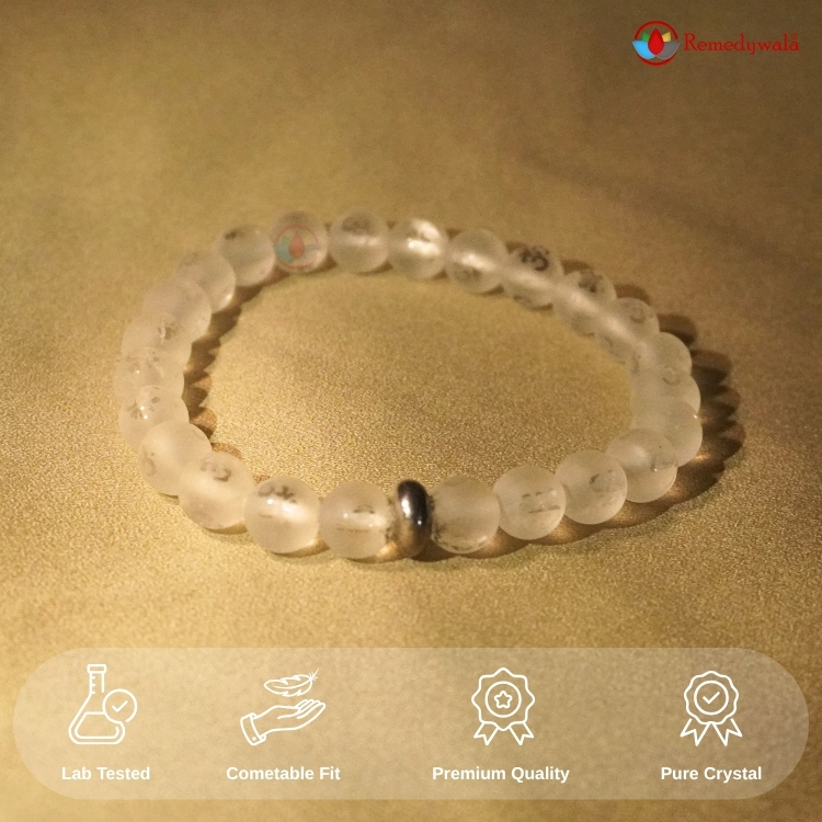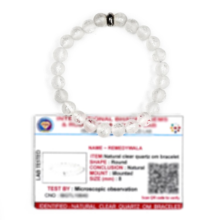 • Material : Natural Healing Clear Quartz OM Stones | SPECIFICATION : Stretchable Elastic Clear Quartz OM Bracelet With Certificate | Stone Size : 8 mm | Shape : Round Stone | Diameter : 2.5 Inch. | Piece : 1