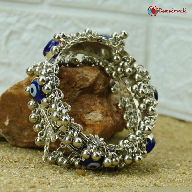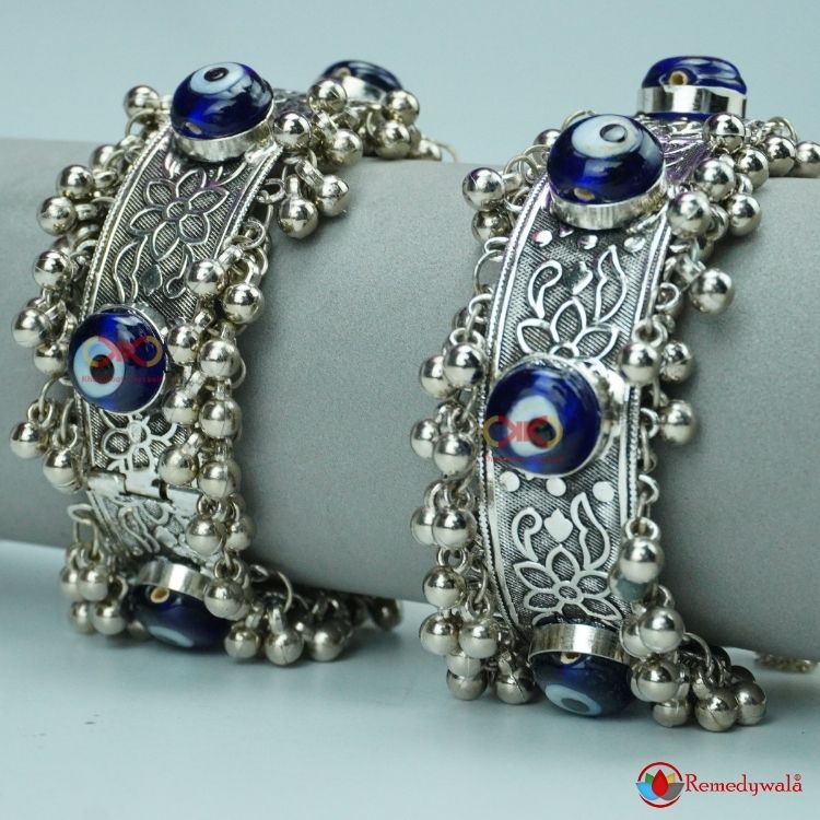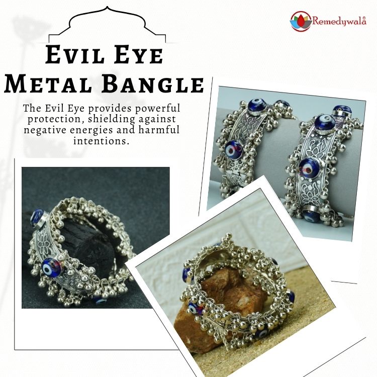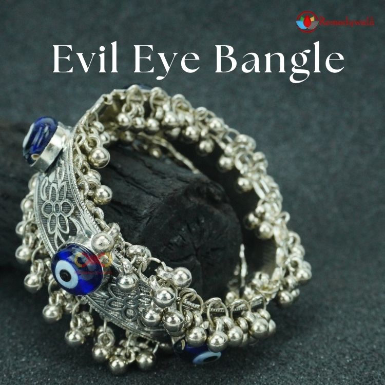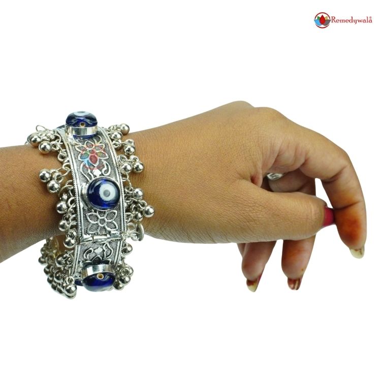 - Add a touch of style and tradition to your look with this beautifully crafted Evil Eye Cuff Bangle. Designed with shimmering silver-tone beads and bold blue evil eye accents, this bangle is perfect for making a statement.