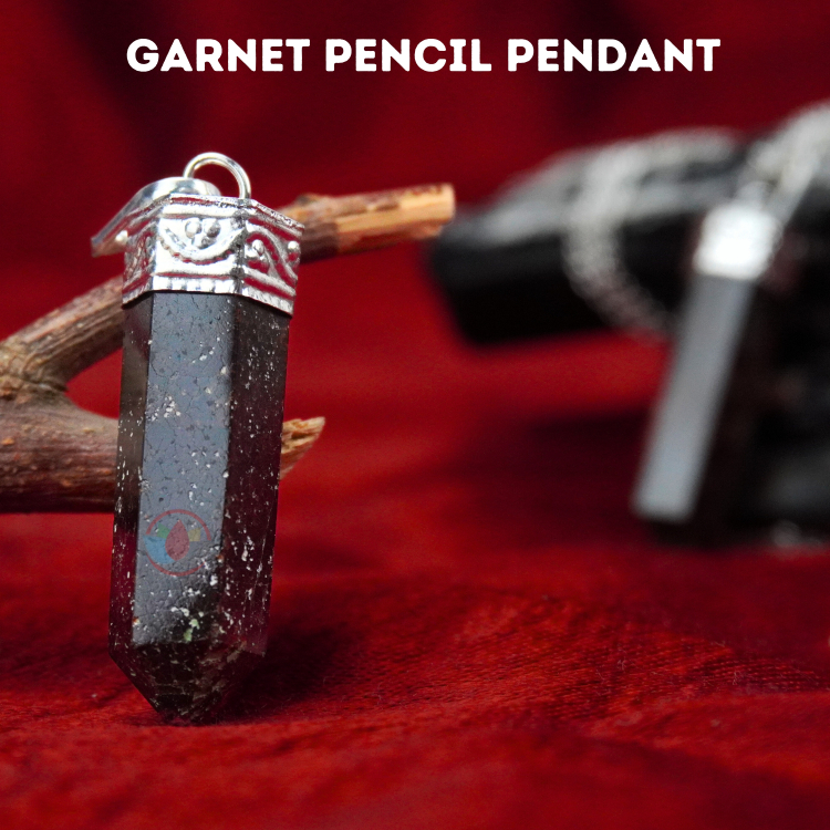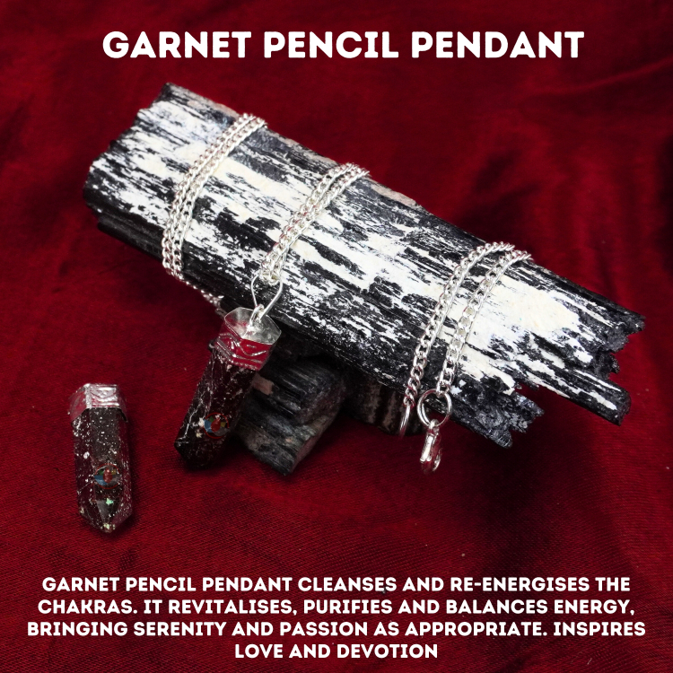 - Garnet Pencil Pendant cleanses and re-energises the chakras. It revitalises, purifies and balances energy, bringing serenity and passion as appropriate. Inspires love and devotion.