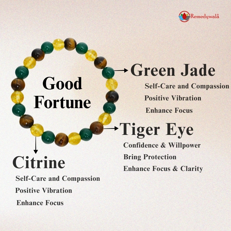 The Good Fortune Bracelet combines the grounding strength of Tiger Eye, the abundant energy of Citrine, and the prosperous protection of Green Jade. Together, they invite luck, wealth, and harmony, supporting both success and inner balance.