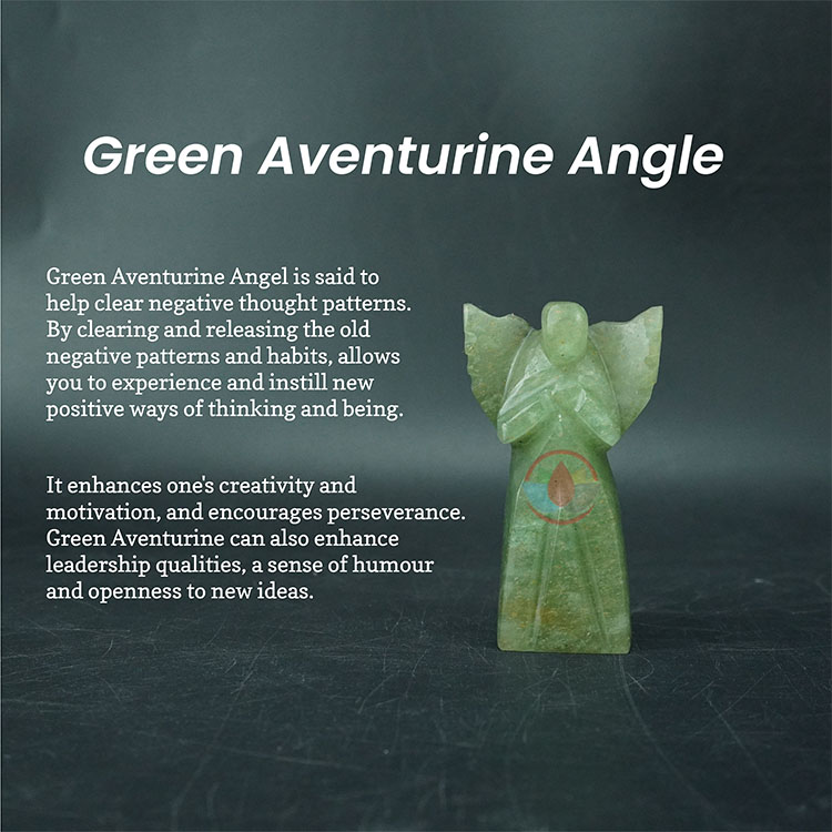 • Green Aventurine Angel enhances one’s creativity and motivation, and encourages perseverance. Green Aventurine can also enhance leadership qualities, a sense of humour and openness to new ideas.