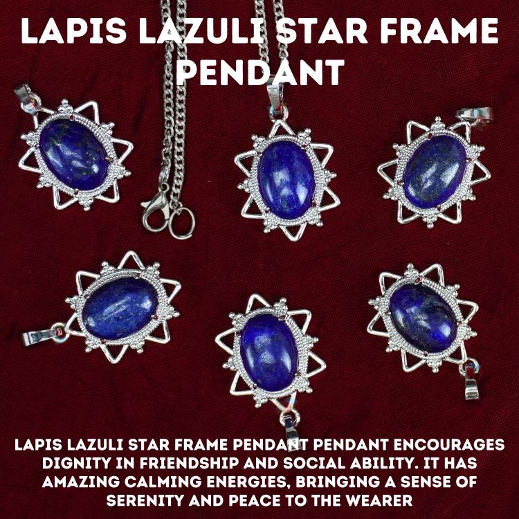 • Lapis Lazuli Star Frame Pendant Pendant encourages dignity in friendship and social ability. It has amazing calming energies, bringing a sense of serenity and peace to the wearer.