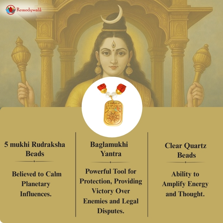 Maa Baglamukhi Kavach is a sacred locket designed to protect you from enemies, negative forces, and harmful energies, while invoking the blessings of Maa Baglamukhi for strength, courage, and victory.