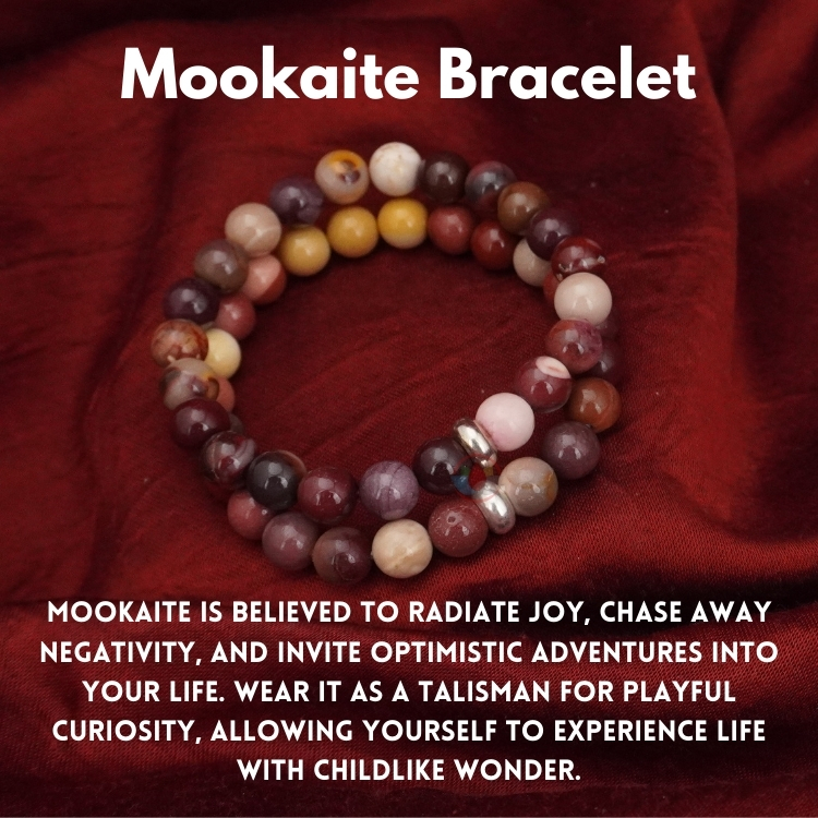 - Mookaite is believed to radiate joy, chase away negativity, and invite optimistic adventures into your life. Wear it as a talisman for playful curiosity, allowing yourself to experience life with childlike wonder.
