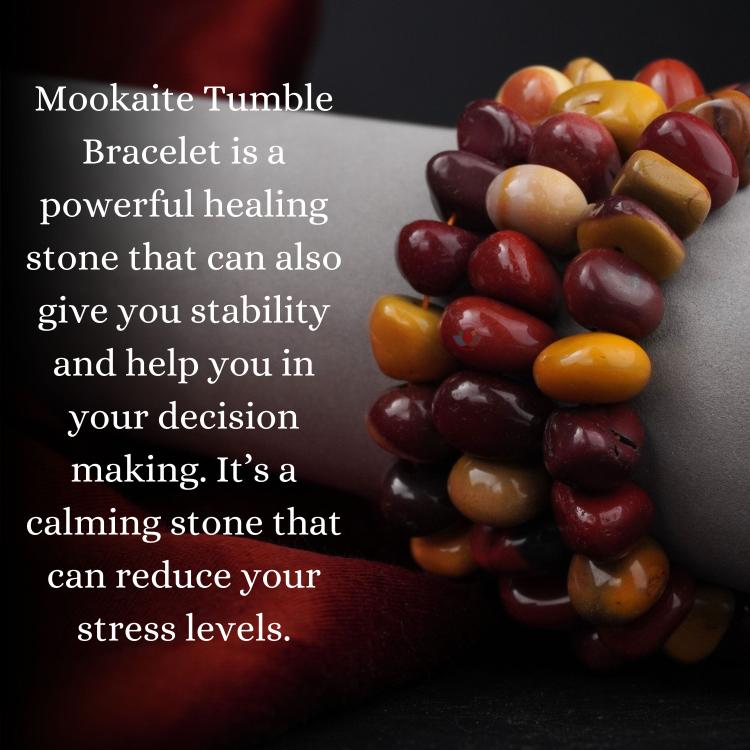 - Mookaite Tumble Bracelet is a powerful healing stone that can also give you stability and help you in your decision-making. It’s a calming stone that can reduce your uneasiness.