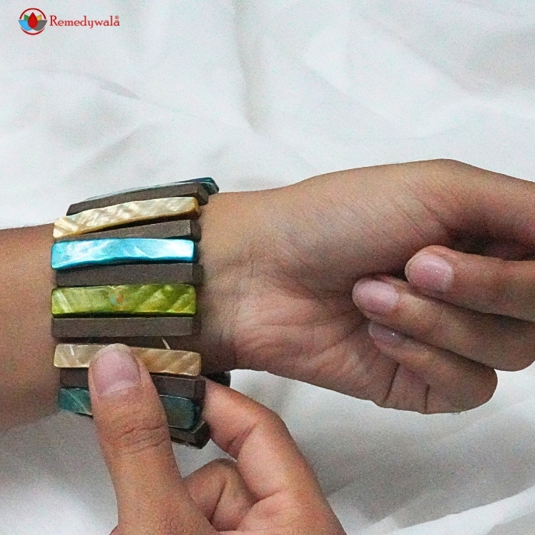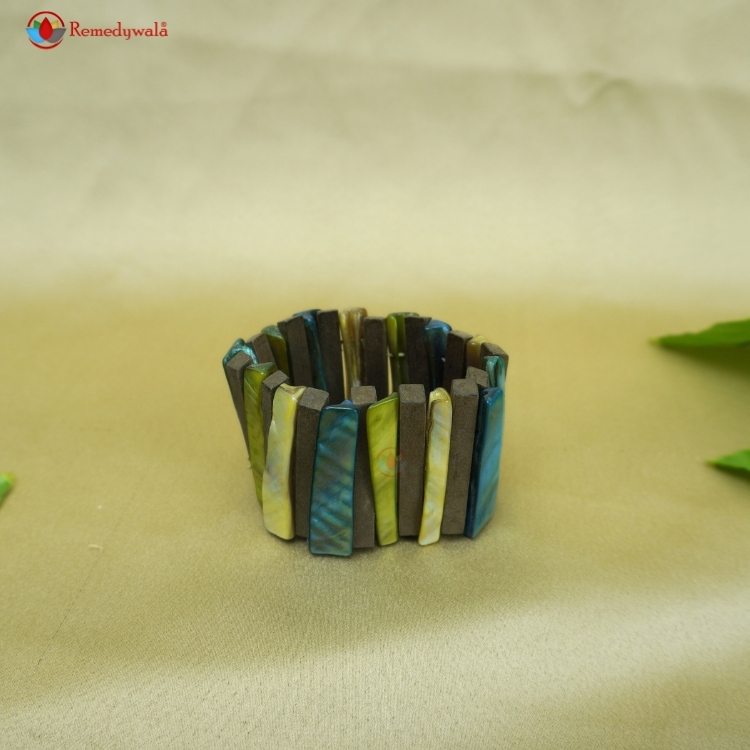 Natural Wood with Mother-of-Pearl Shell Bracelet – Multi-Color Stretch Cuff promotes grounding & connection with nature, Symbolizes unity between earth and sea.