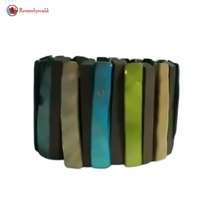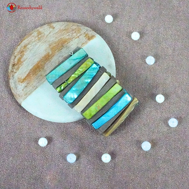 The multi-colored mother-of-pearl pieces reflect stunning shades of blue, green, beige, and cream, making each bracelet truly unique.