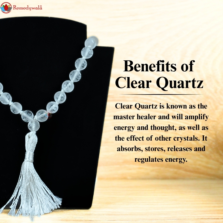 - Clear Quartz Mala is known for its ability to bring balance, and enhance meditation practices. It has energy properties that help with clarity of the mind, amplifying energy. Wearing this Mala can help you remain calm and centered in uneasy situations.