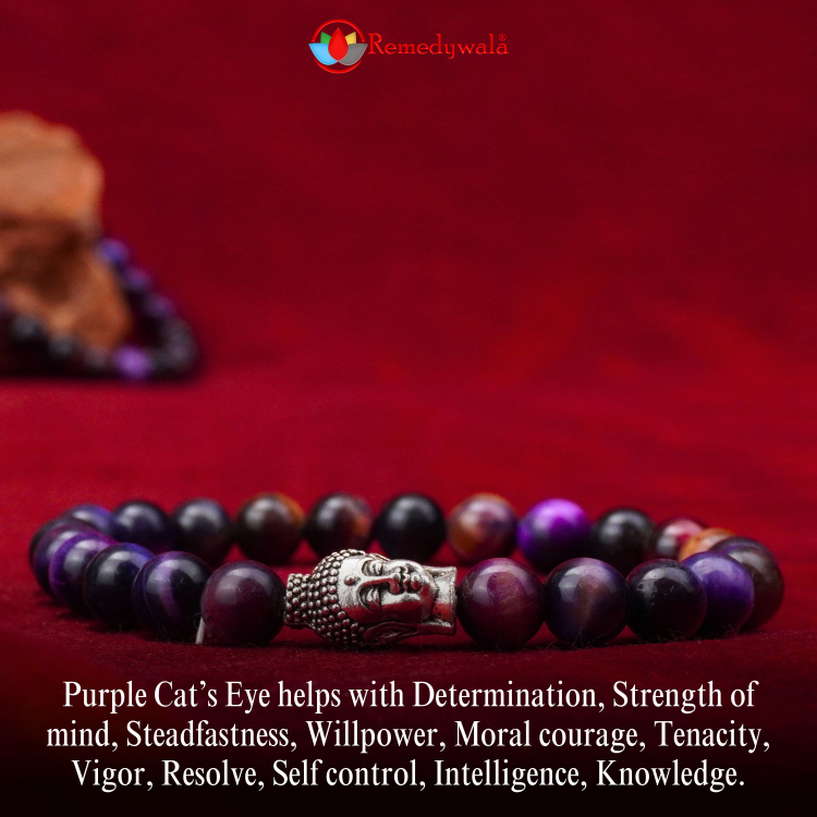 - Purple Cat’s Eye helps with Determination, Strength of mind, Steadfastness, Willpower, Moral courage, Tenacity, Vigor, Resolve, Self control, Intelligence, Knowledge.
