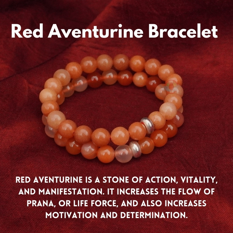 - Red Aventurine Bracelet is often called the stone of “prosperity”. It’s known for promoting compassion and empath, stabilized the calms anger and irritation.