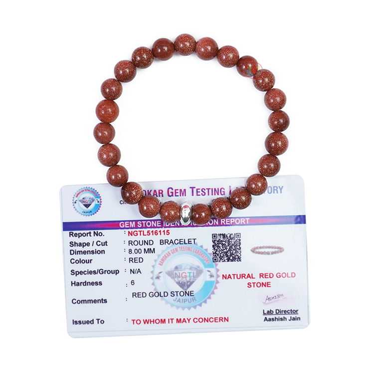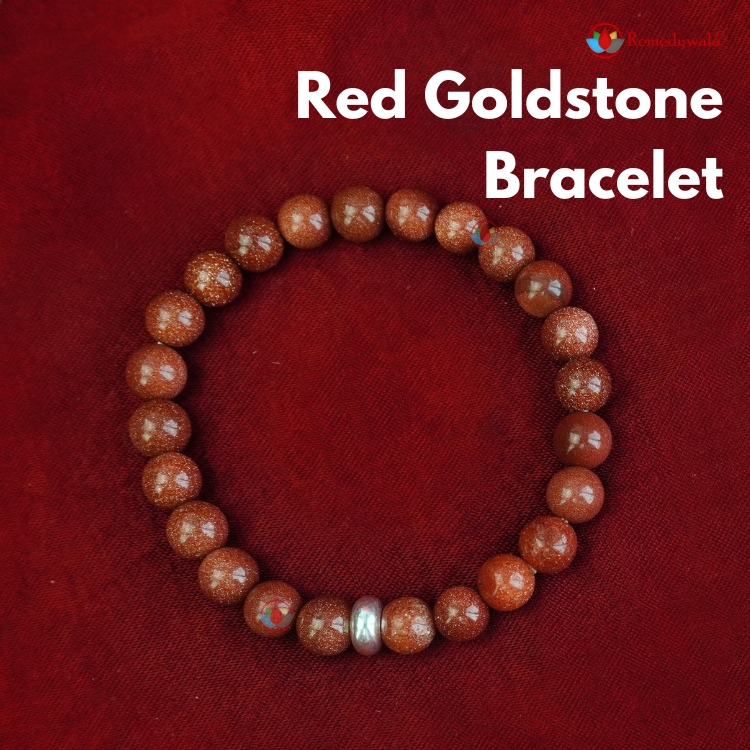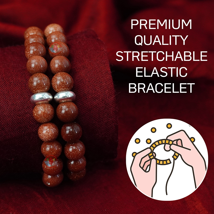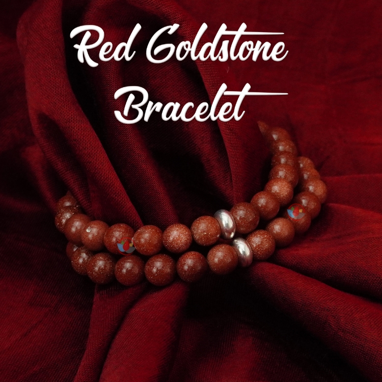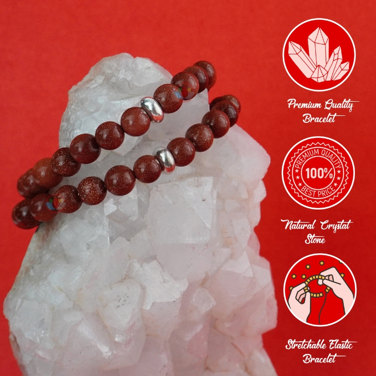 - It is an extremely uplifting stone, as it’s sparkly aura + look is contagious! The sparkles within Red Goldstone Bracelet come from flecks of copper.