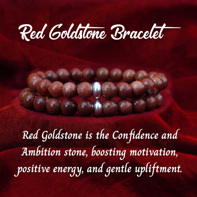 - Red Goldstone Bracelet 8mm single Bracelet Red Goldstone is the Stone of Confidence and Ambition. It encourages motivation and drive within the person.