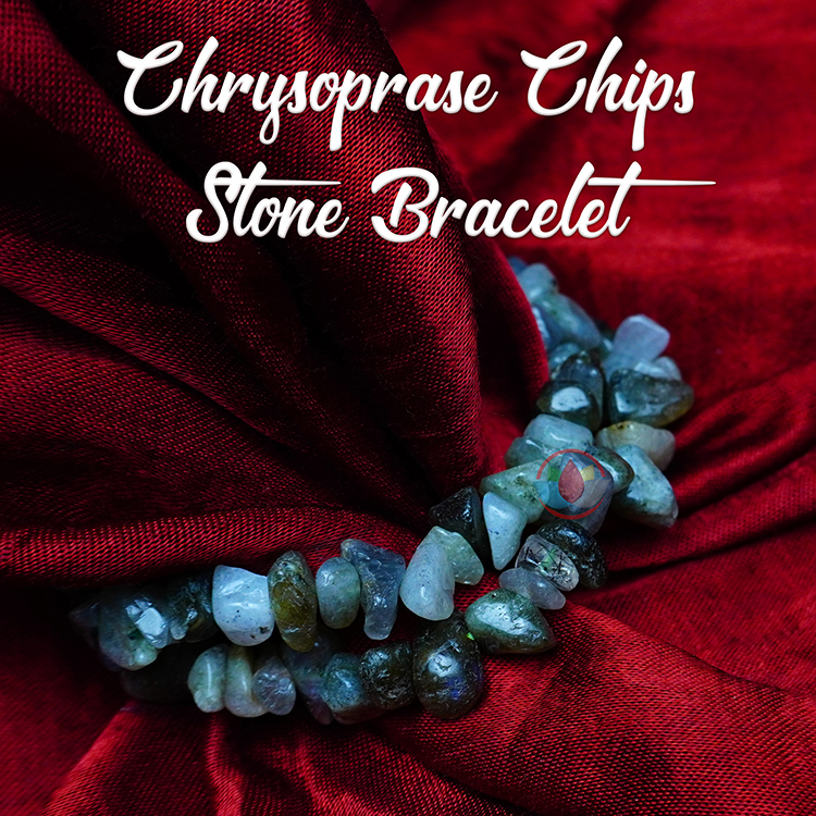 • Chrysoprase Chips Bracelet The name ‘chrysoprase’ originates from the Greek words, ‘chrusos’ and ‘prison’, meaning ‘gold’ and ‘leek’, respectively; referring to its leek-green color and the presence of golden inclusions.