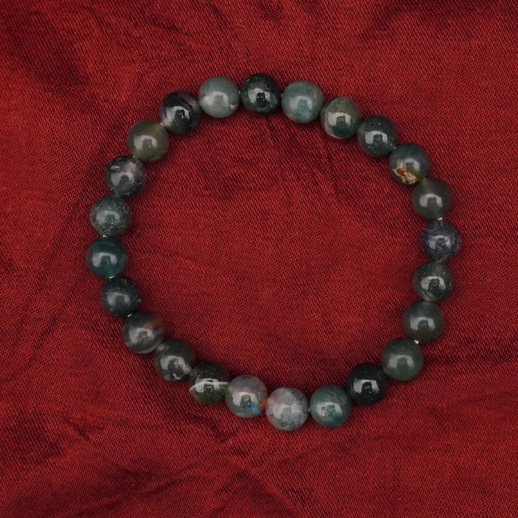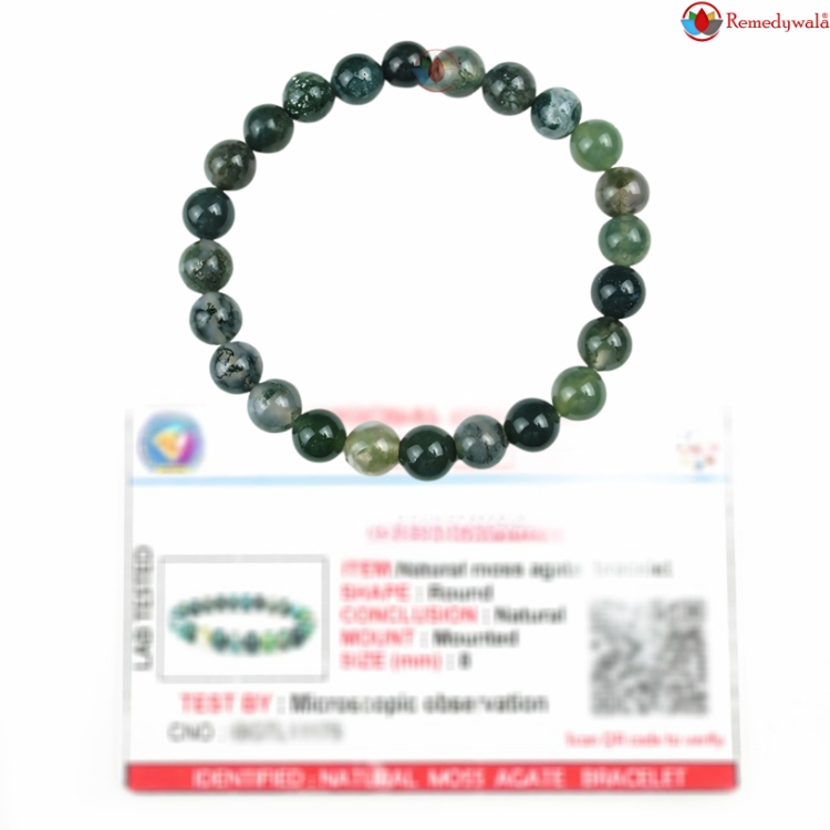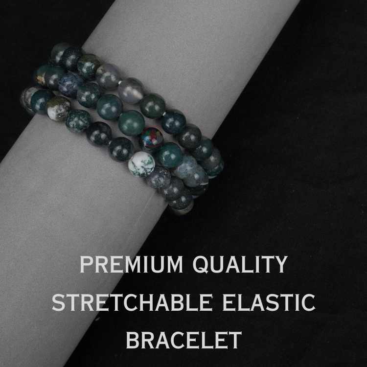 - Material : Natural Healing Moss Agate Stones | SPECIFICATION : Stretchable Elastic Moss Agate Bracelet With Certificate | Stone Size : 8 mm | Shape : Round Stone | Diameter : 2.5 Inch. | Piece : 1