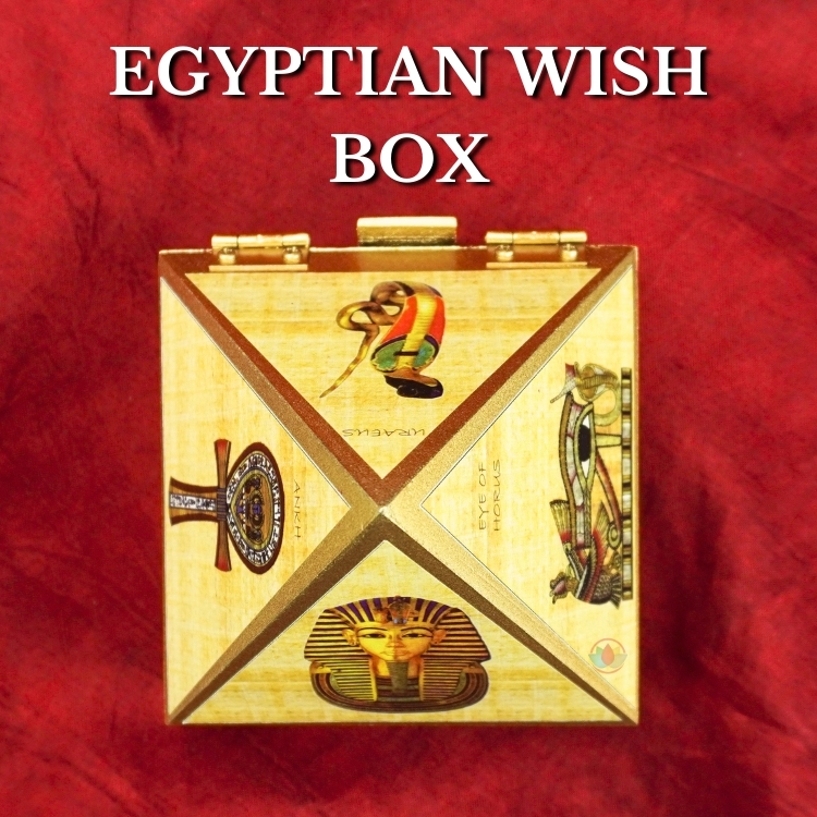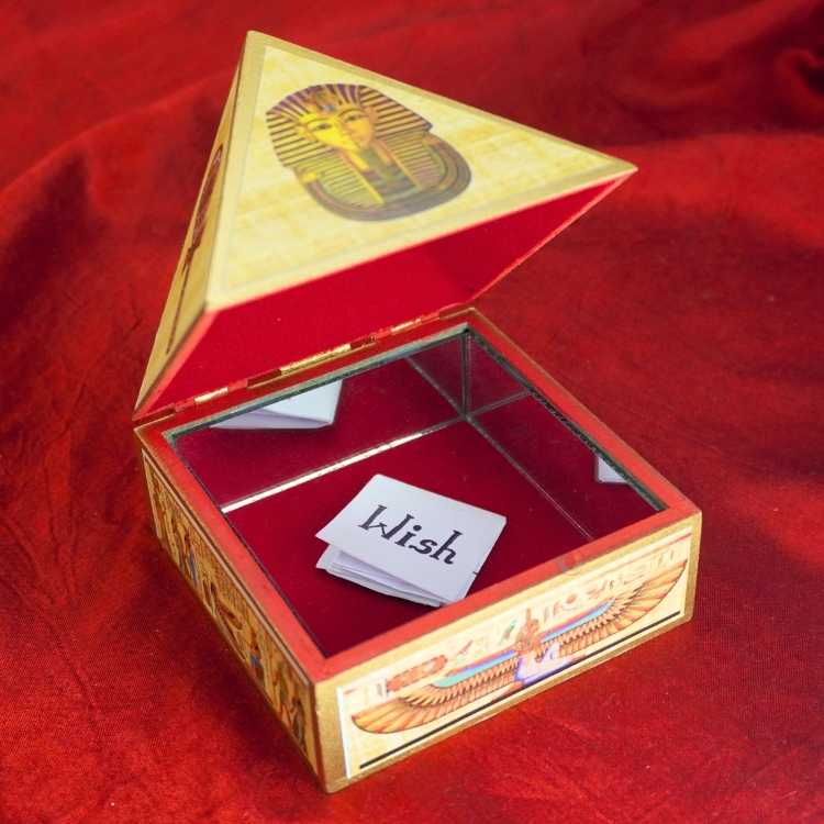 • Egyptian wish box Wooden Pyramid Plain Wish Box – Reiki Crystal Products: This wish box comes in sizes of 4″,  features a lid with an om symbol