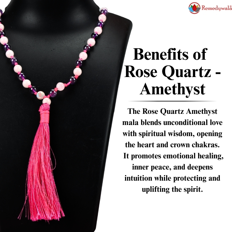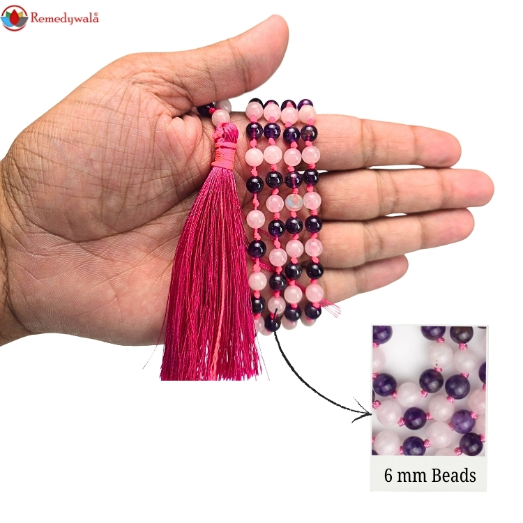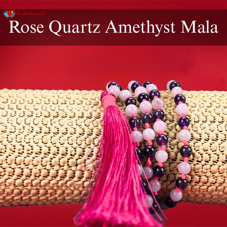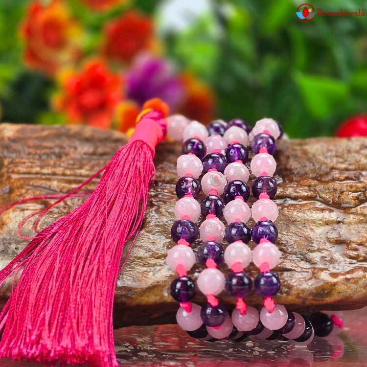 - Rose Quartz Amethyst Japa Mala helps in identifying the root causes behind one’s negative behaviors, habits, emotional patterns.