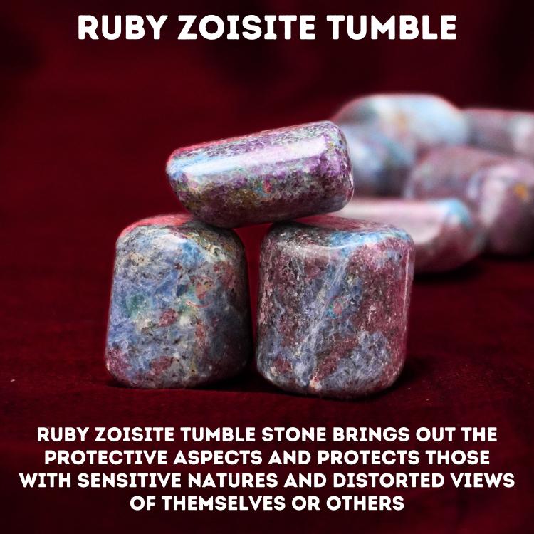 - Ruby Zoisite Tumble Stone brings out the protective aspects and protects those with sensitive natures and distorted views of themselves or others.