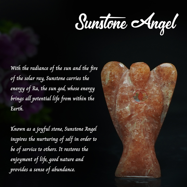 • Known as a joyful stone, Sunstone Angel inspires the nurturing of self in order to be of service to others. It restores the enjoyment of life, good nature and provides a sense of abundance.