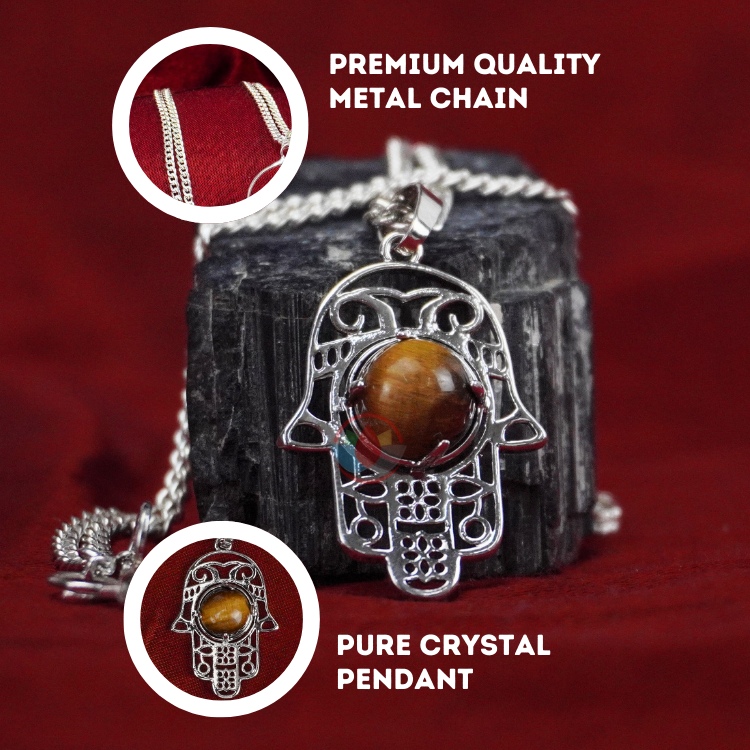 • Tiger Eye Humsa Pendant with Metal Chain. Reiki Healing and Crystal Healing Humsa Tiger Eye Pendant for Women and Men