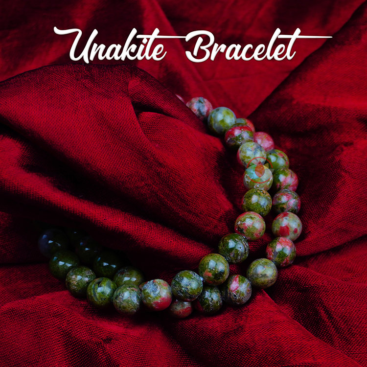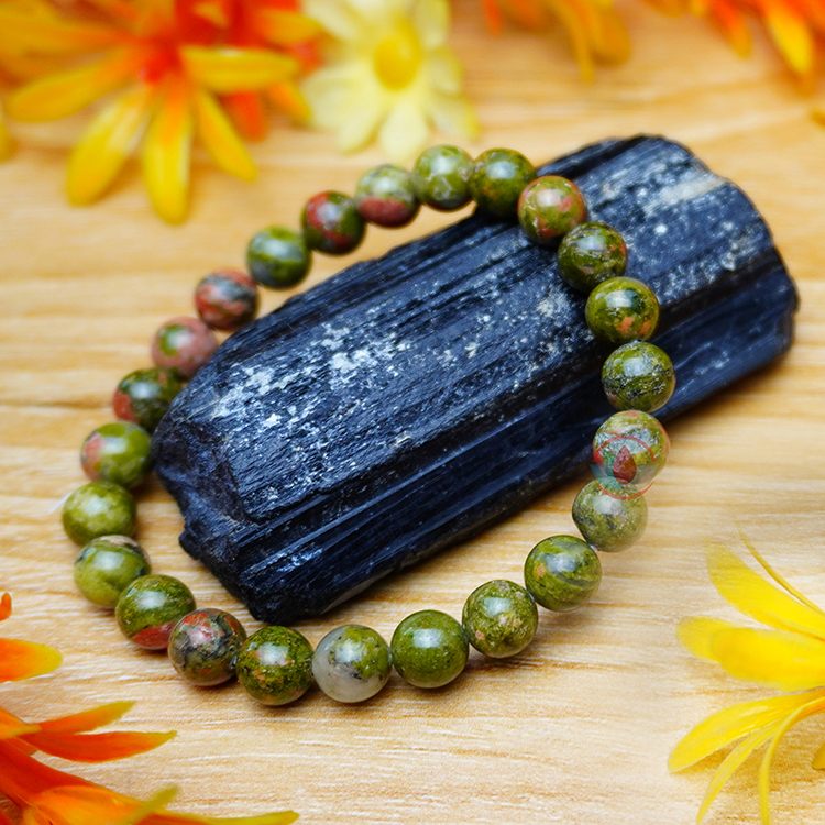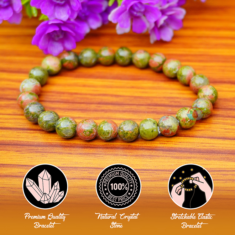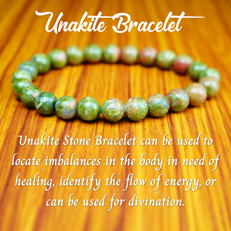 - Unakite Bracelet 8mm brings together the abundant, nurturing energy of green with the soft, caring passion of pink in one of Nature’s most healing crystals of the heart and mind.