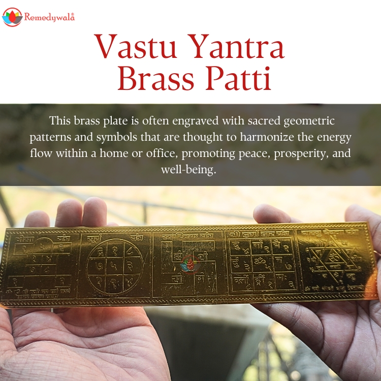 The Vastu Yantra Patti is a special metal strip with sacred symbols that help bring positive energy into a place. It is designed to remove negative effects and balance the energy in homes, offices, or any space.