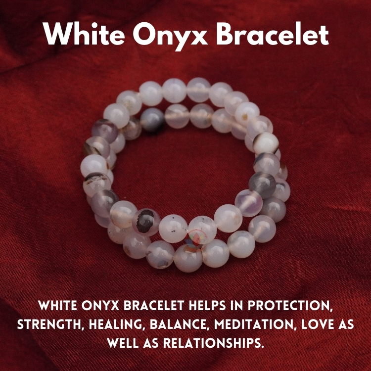 - White Onyx Bracelet helps in Protection, Strength, Healing, Balance, Meditation, Love as well as Relationships.